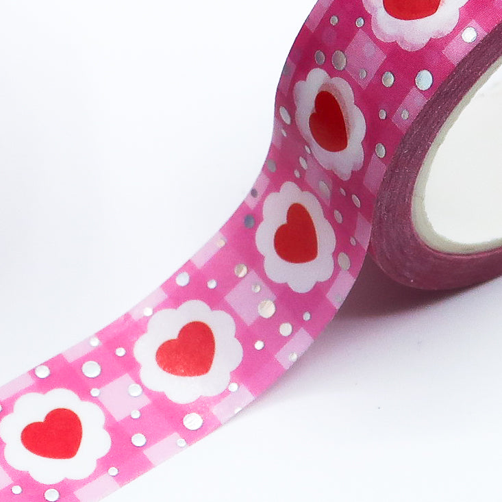 One roll of 15mm washi tape with a cute pink gingham and red heart design with pretty polkadots in holo foil.
