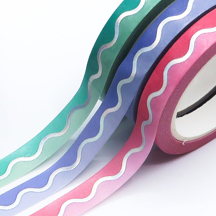 One set of 3 rolls of 7mm washi tape featuring a 2 tone design on each with a holo foil wavy line through the center. Can be used together a a set or individually.