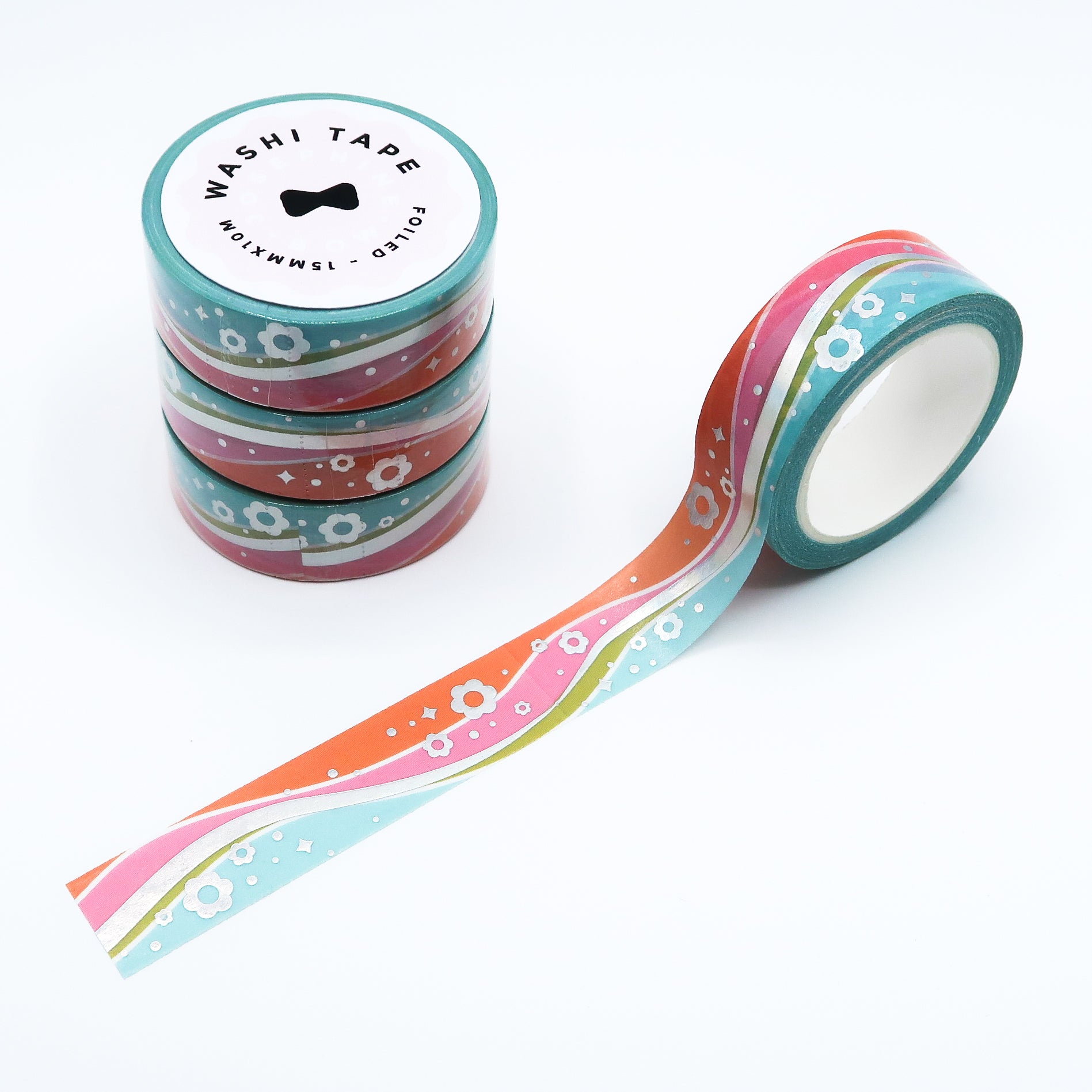 One roll of 15mm washi tape with a colourful retro waves and holographic daisy and polkadot design.
