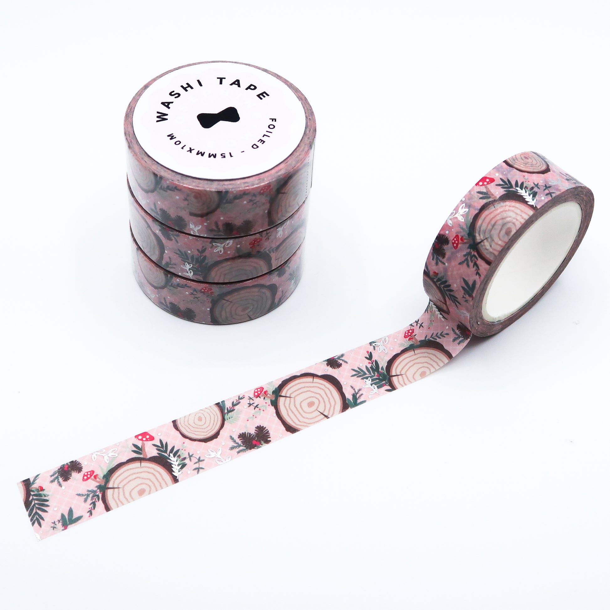 One roll of 15mm washi tape with a delicate woodland design and pale pink background.