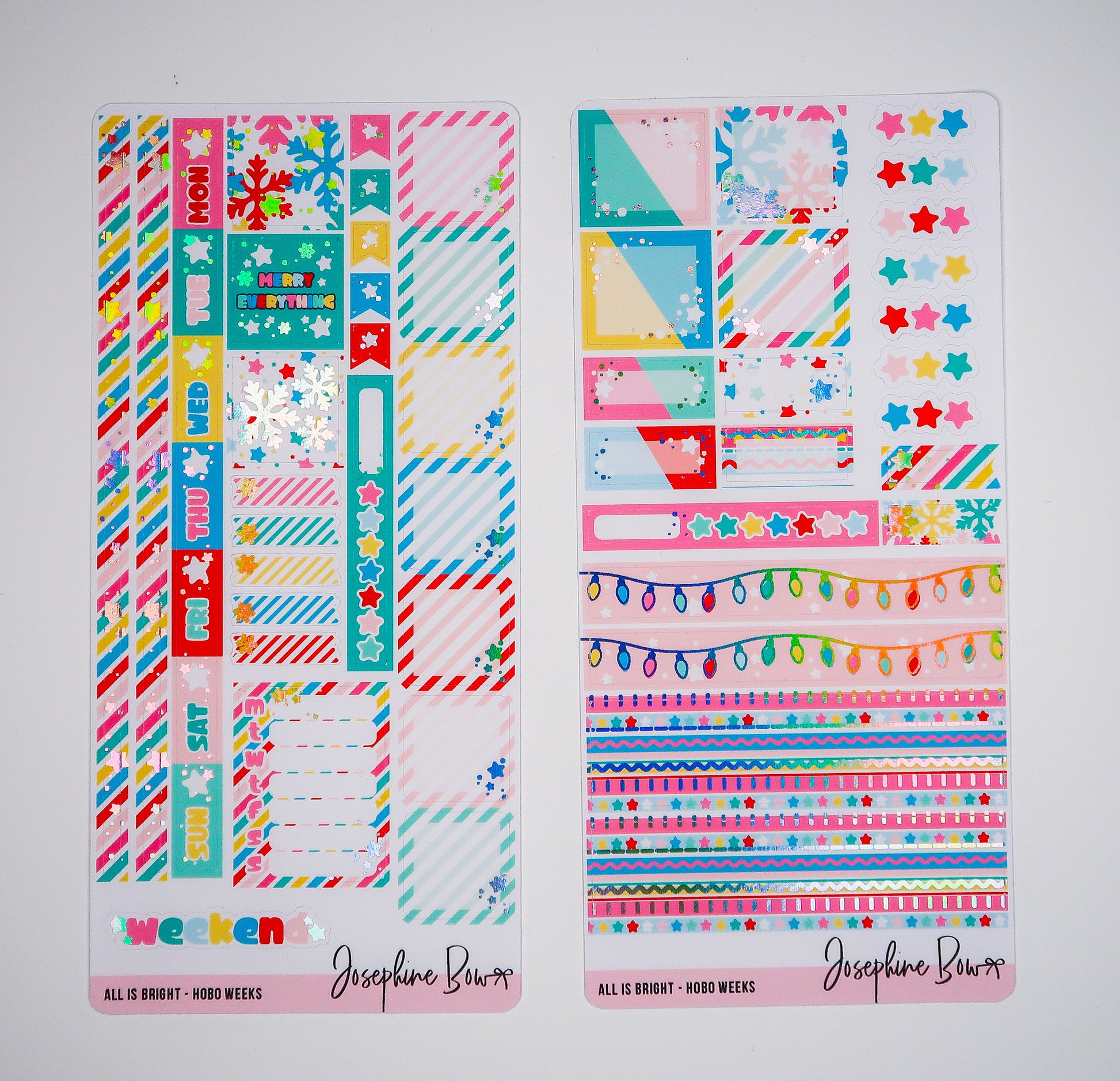 This is a holographic foiled weekly kit designed for the Hobonichi Weeks. It includes deco boxes, functional boxes, date covers, washi strips, checklists, icons and more.