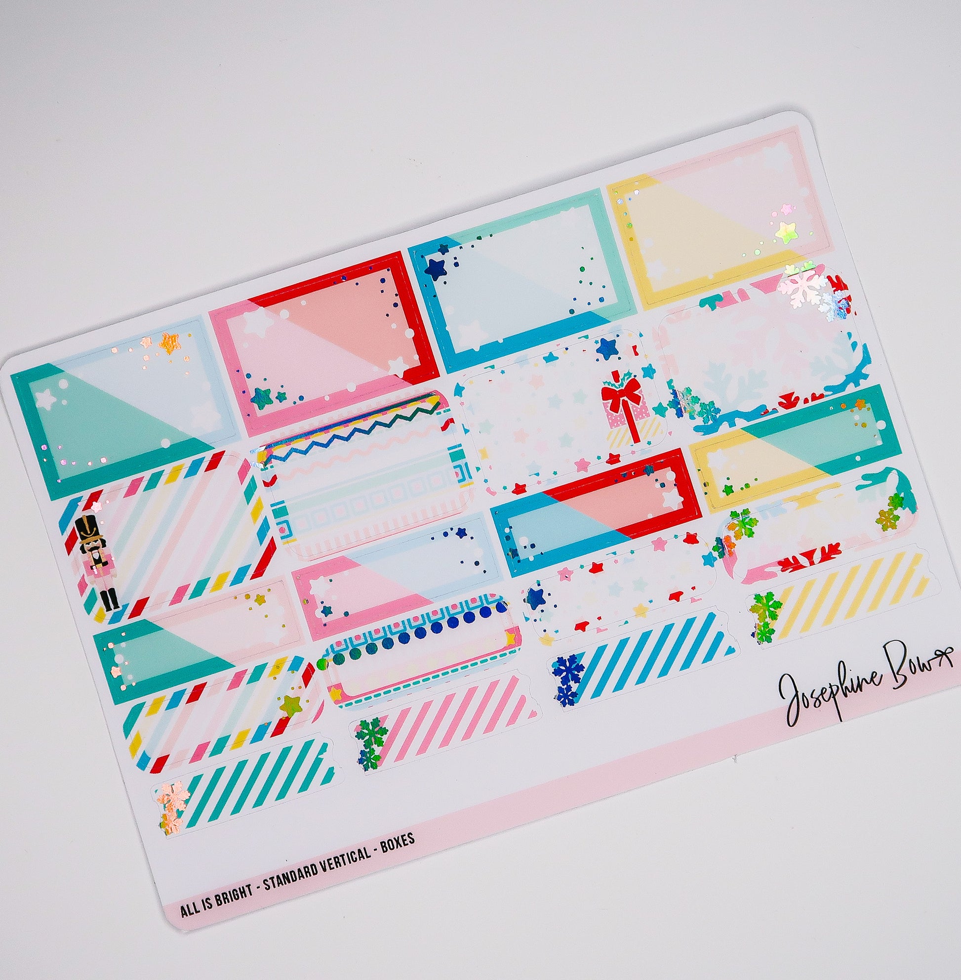 It contains 4 foiled pages with option to add a header sheet. The kit includes, deco boxes, functional boxes, date covers, washi strips, checklists, icons and more.