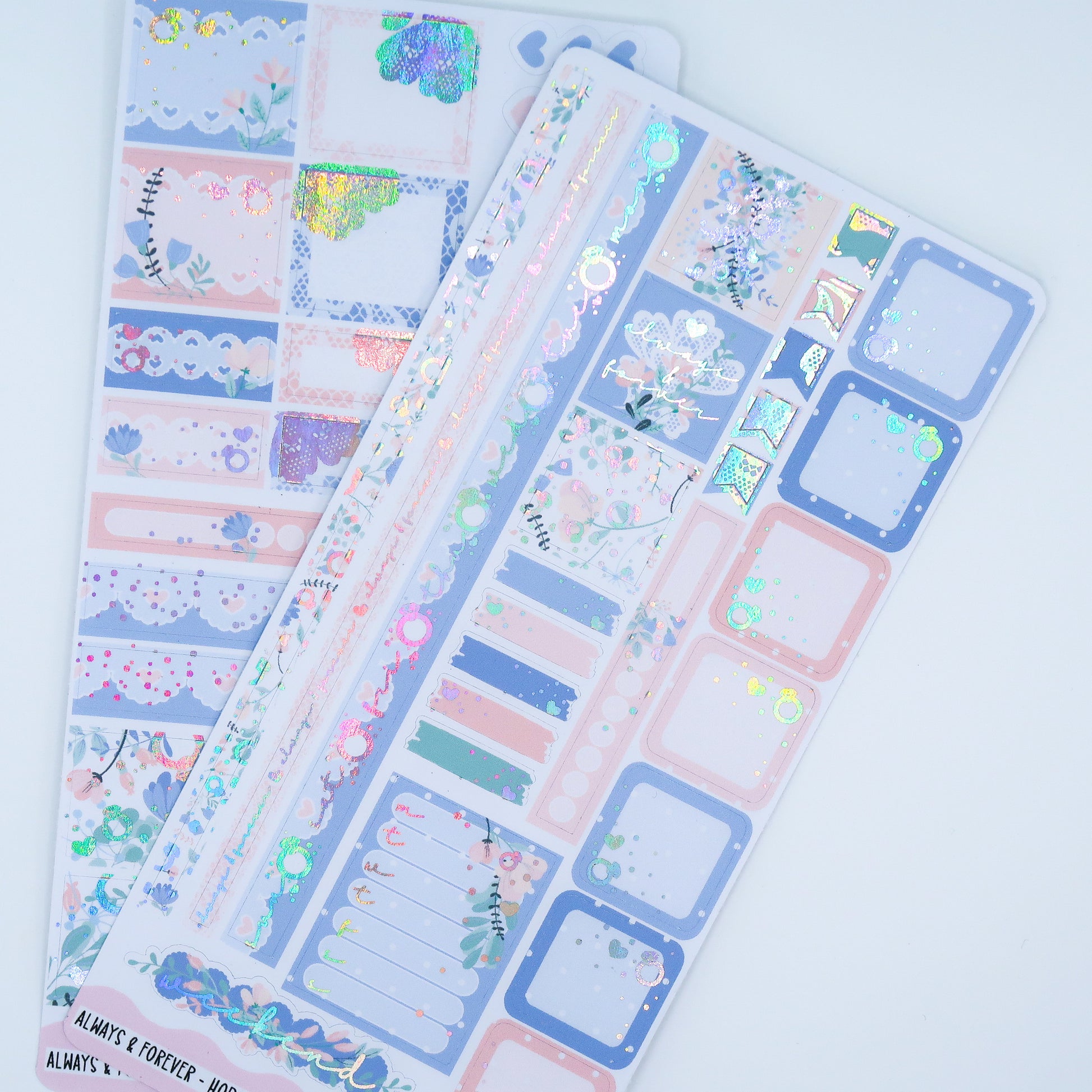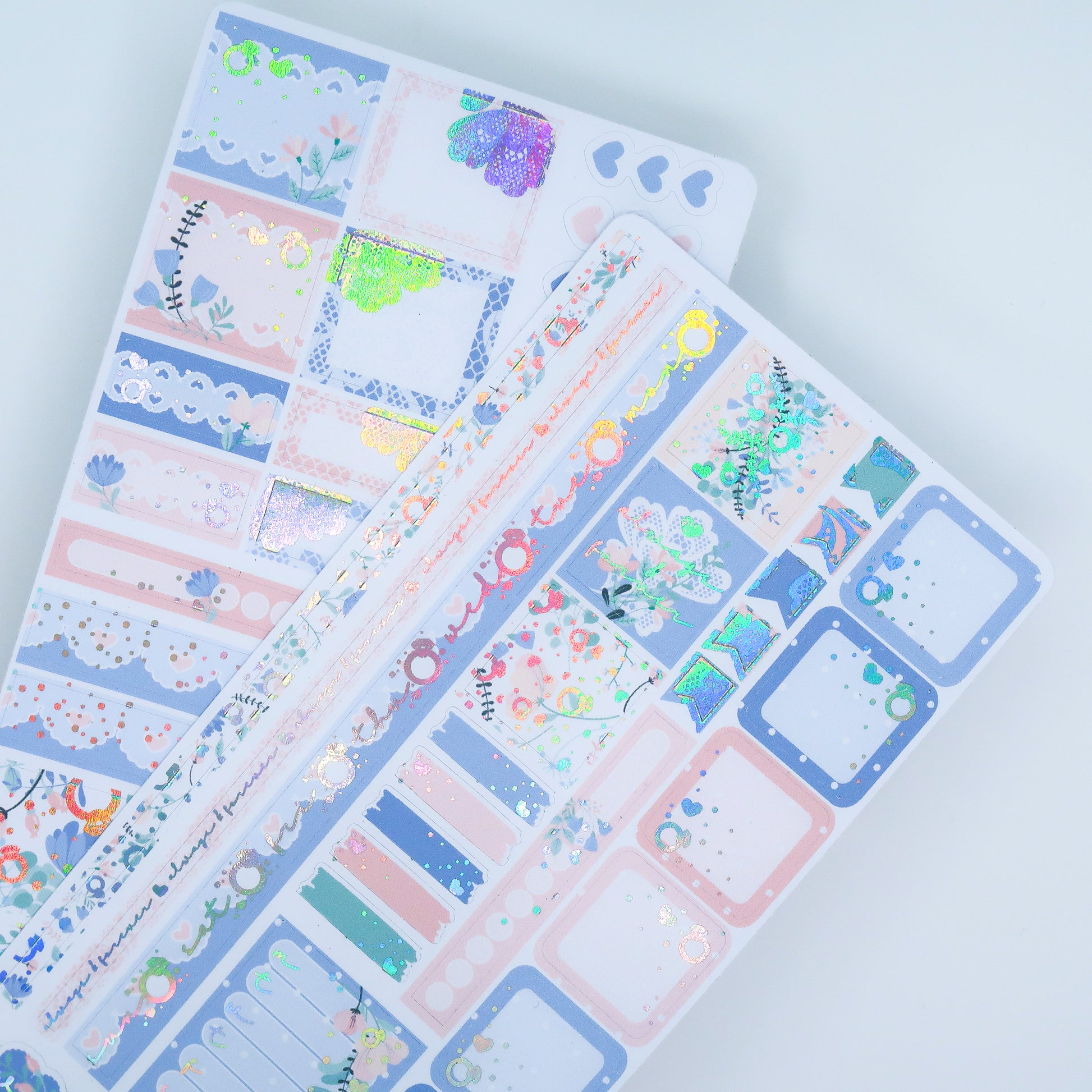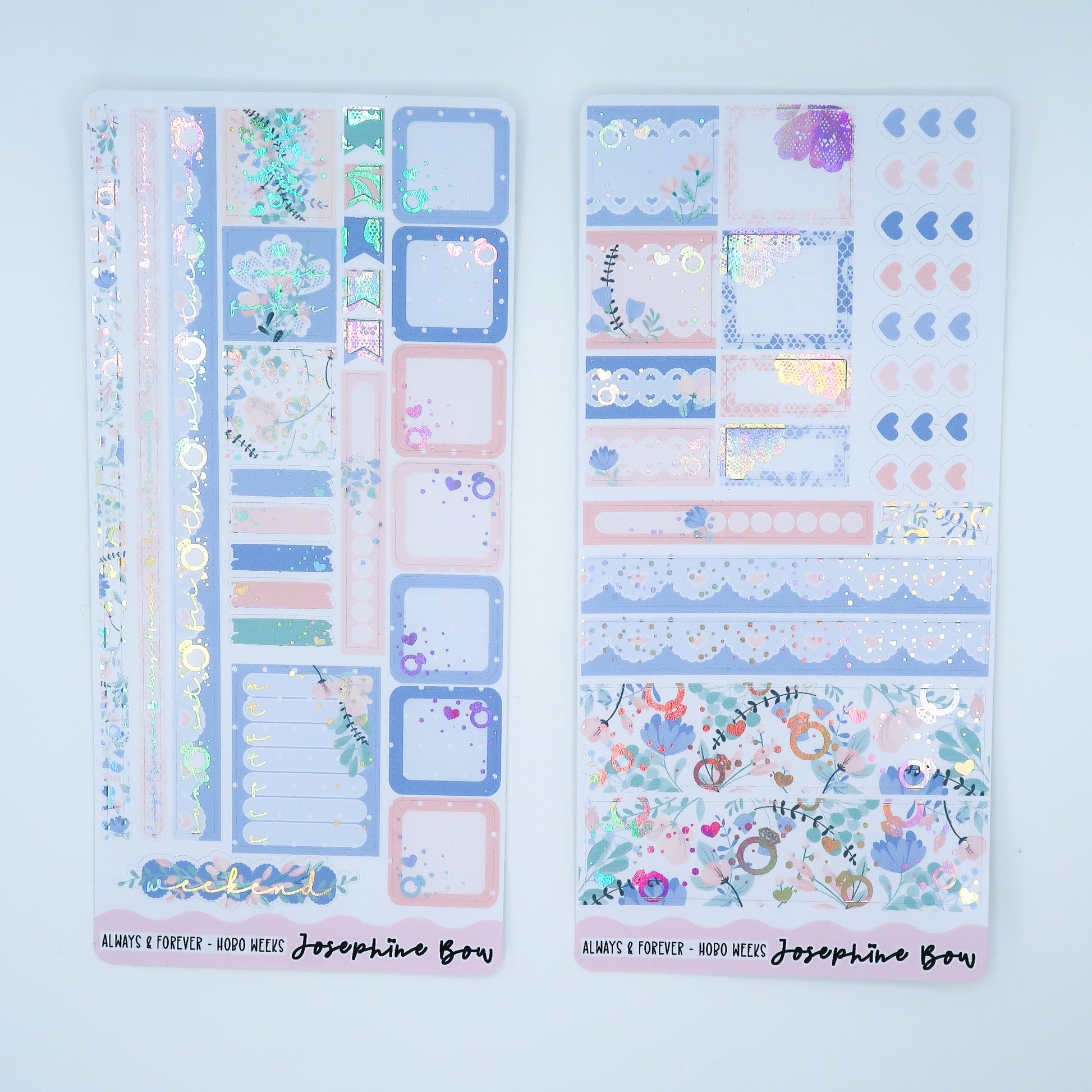 This is a holographic foiled weekly kit designed for the Hobonichi Weeks. It includes deco boxes, functional boxes, date covers, washi strips, checklists, icons and more.