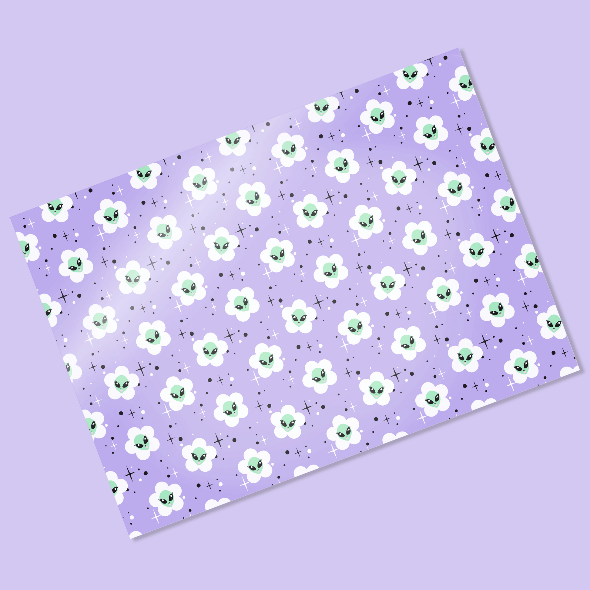 This is one sheet of A4 printed vellum or acetate with an Alien and Daisy design and star backdrop to co-ordinate with the Beam Me Up collection.