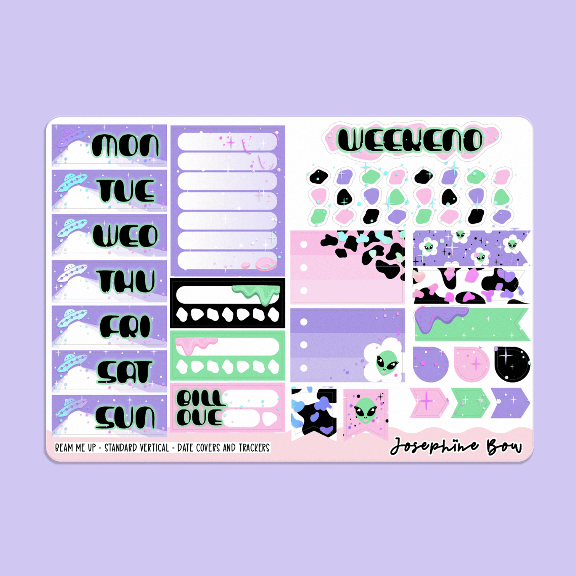 Beam Me Up is a cutesy cosmic mix of aliens, daisies, stars, and cow print - ideal for adding a playful dose of outer space to your planning.