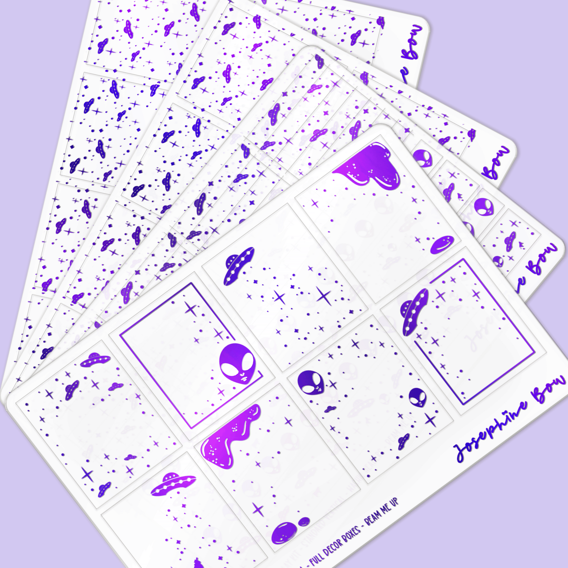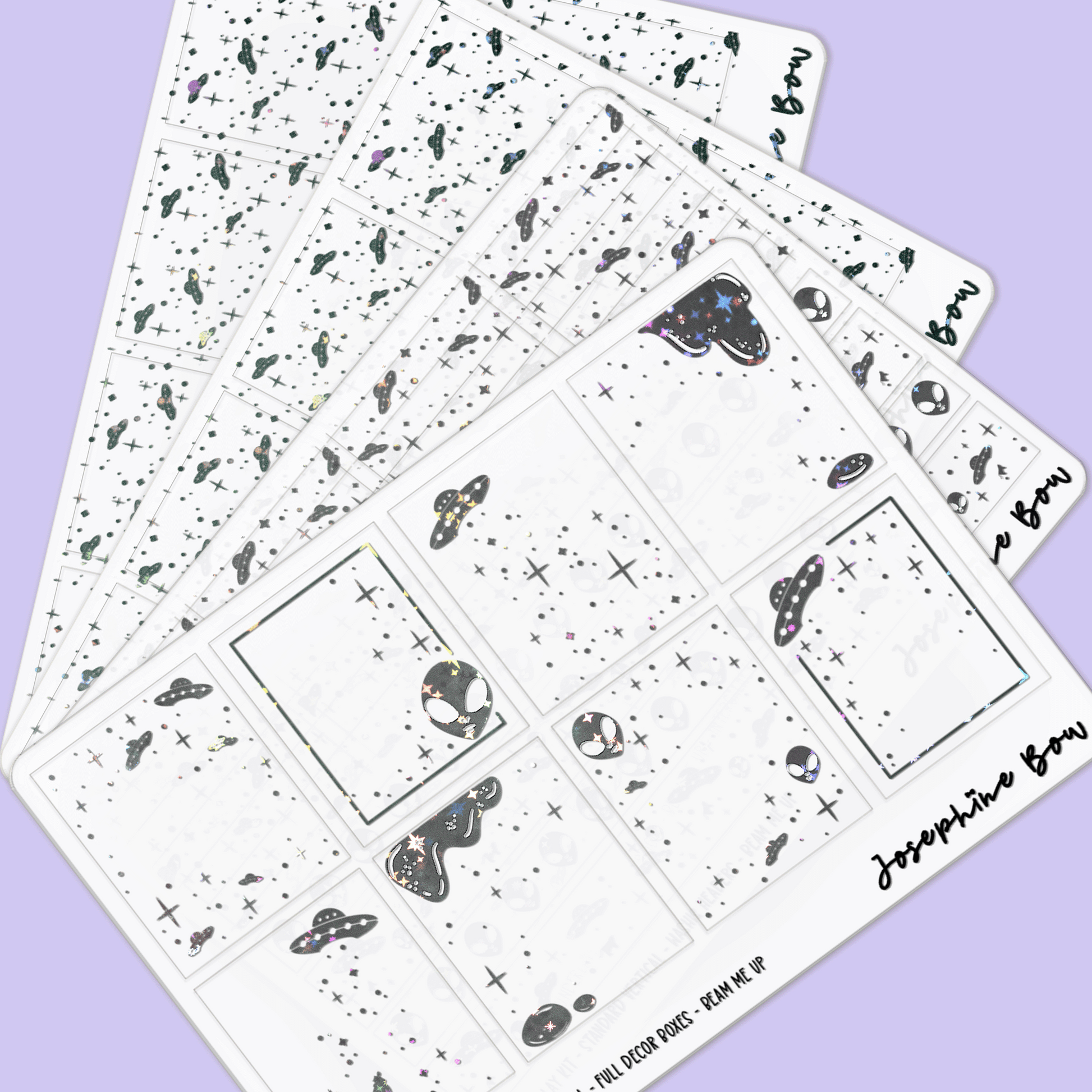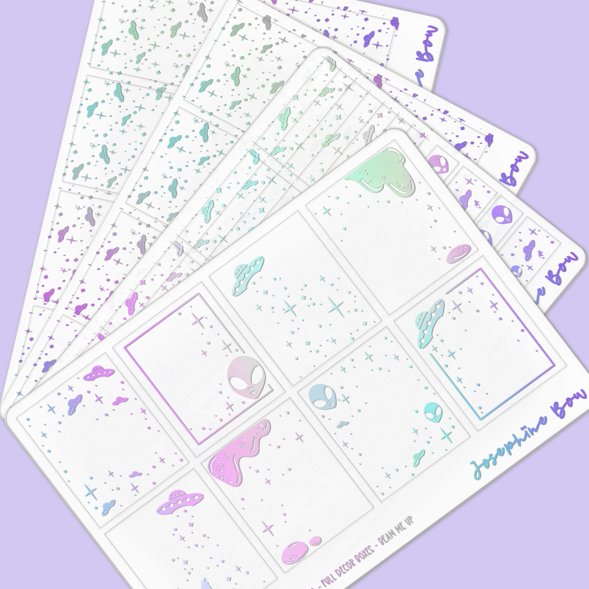 Alien and UFO themed transparent foiled weekly overlay kit designed for vertical planners. For example many styles of 1.5in vertical planners and the standard Happy Planner.