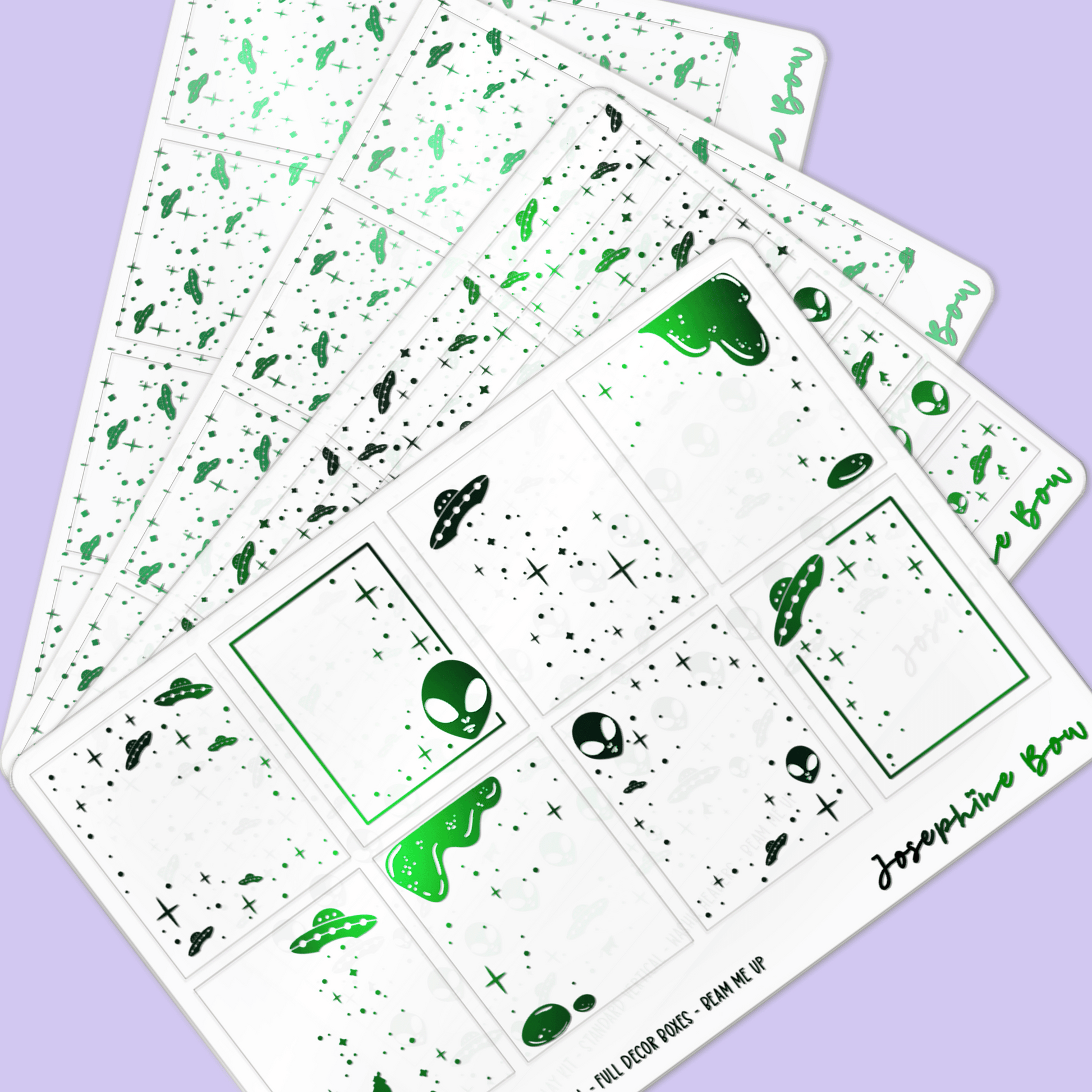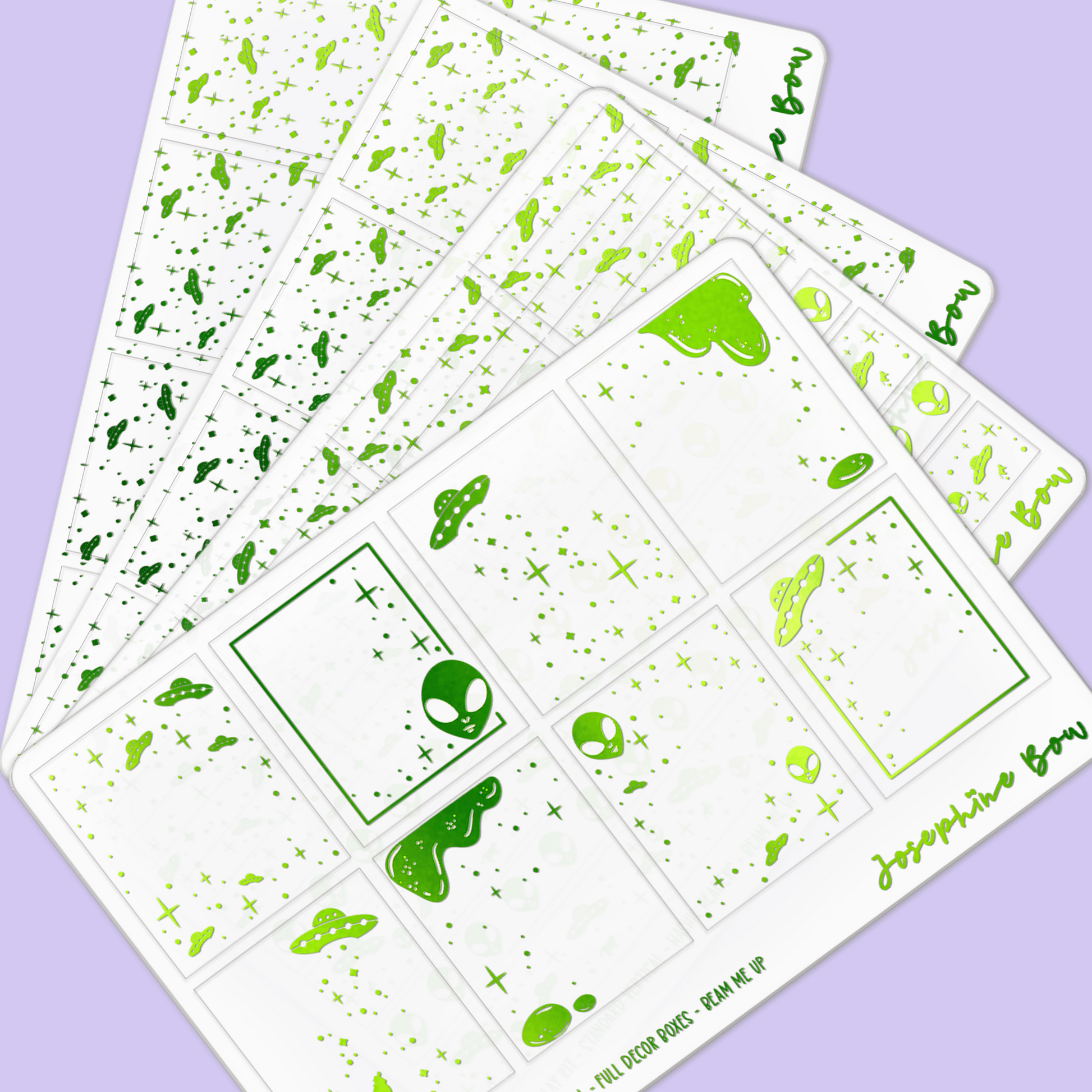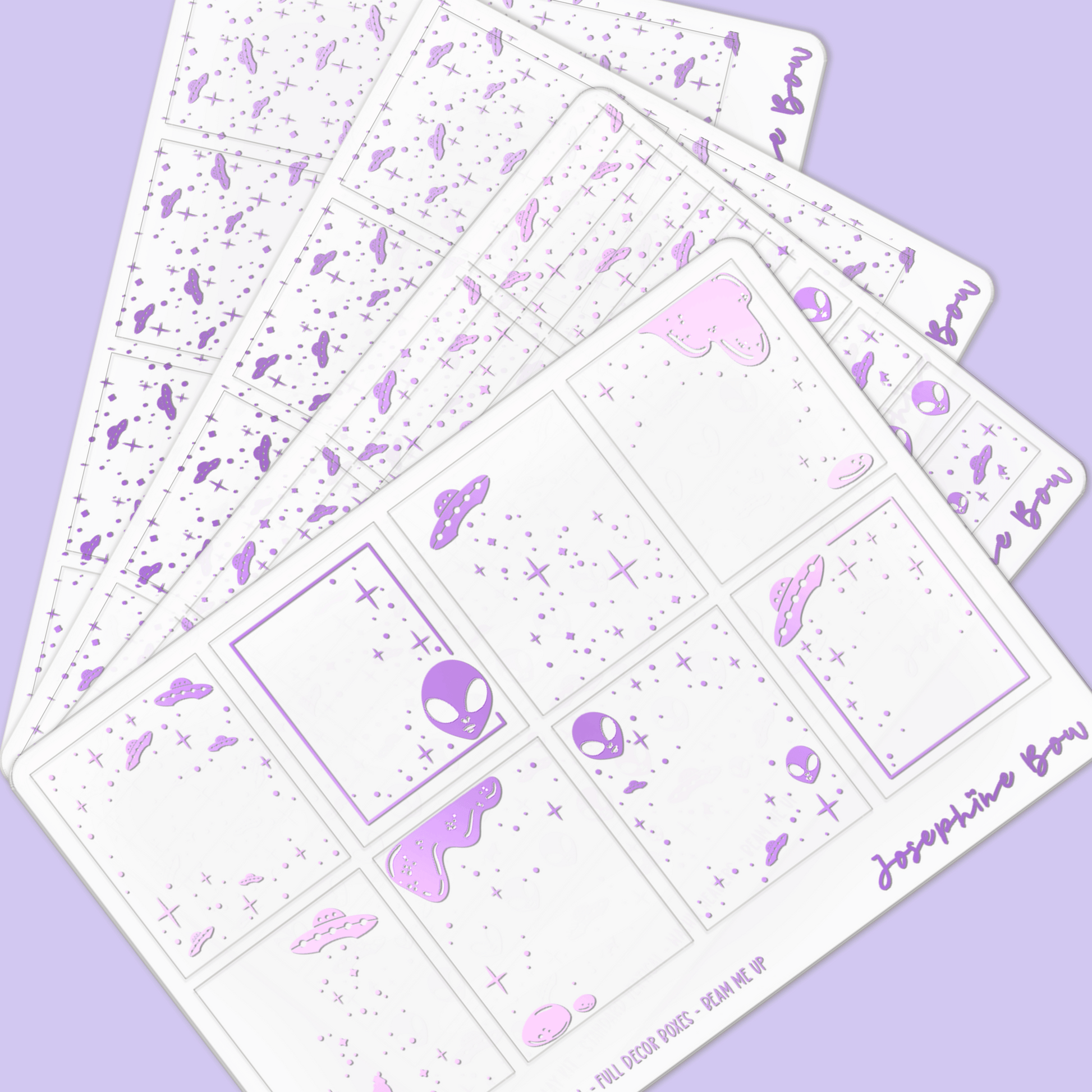 Alien and UFO themed transparent foiled weekly overlay kit designed for vertical planners. For example many styles of 1.5in vertical planners and the standard Happy Planner.