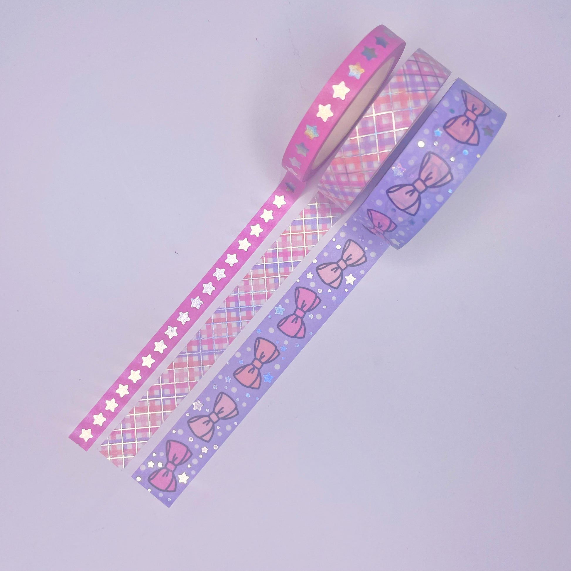 This super cute set of 3 washi feature bows, stars, stripes and pretty flecks of holographic foil. It is a 3-roll set including 15mm, 10mm and 5mm rolls, each 10m in length.