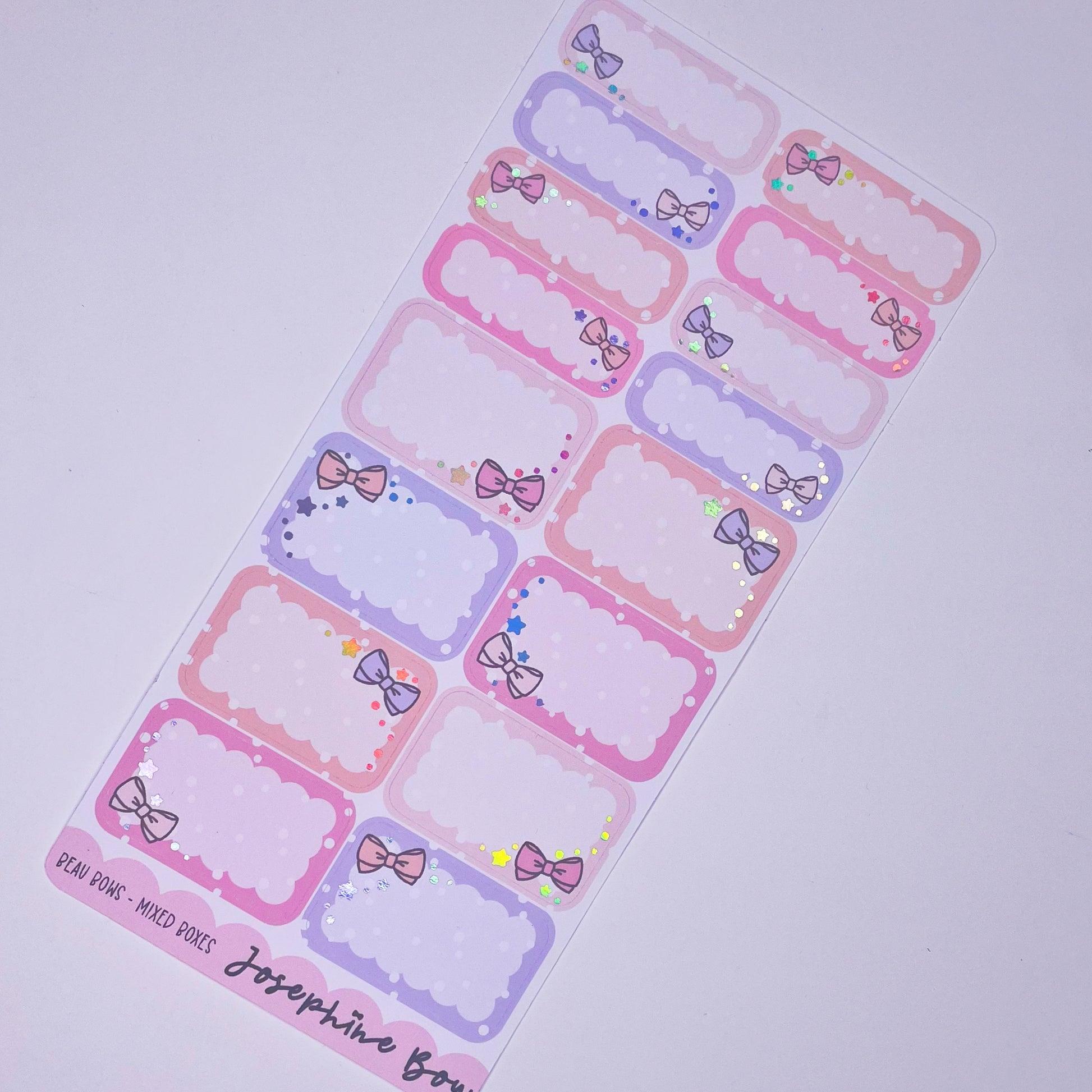This is one sheet of mixed half and quarter boxes in a range of pretty colours with bow deco and foil decoration. These are great essentials to have in your collection for mixing with kits, co-ordinating with your favourite washi or just using to highlight a particularly important task or event.