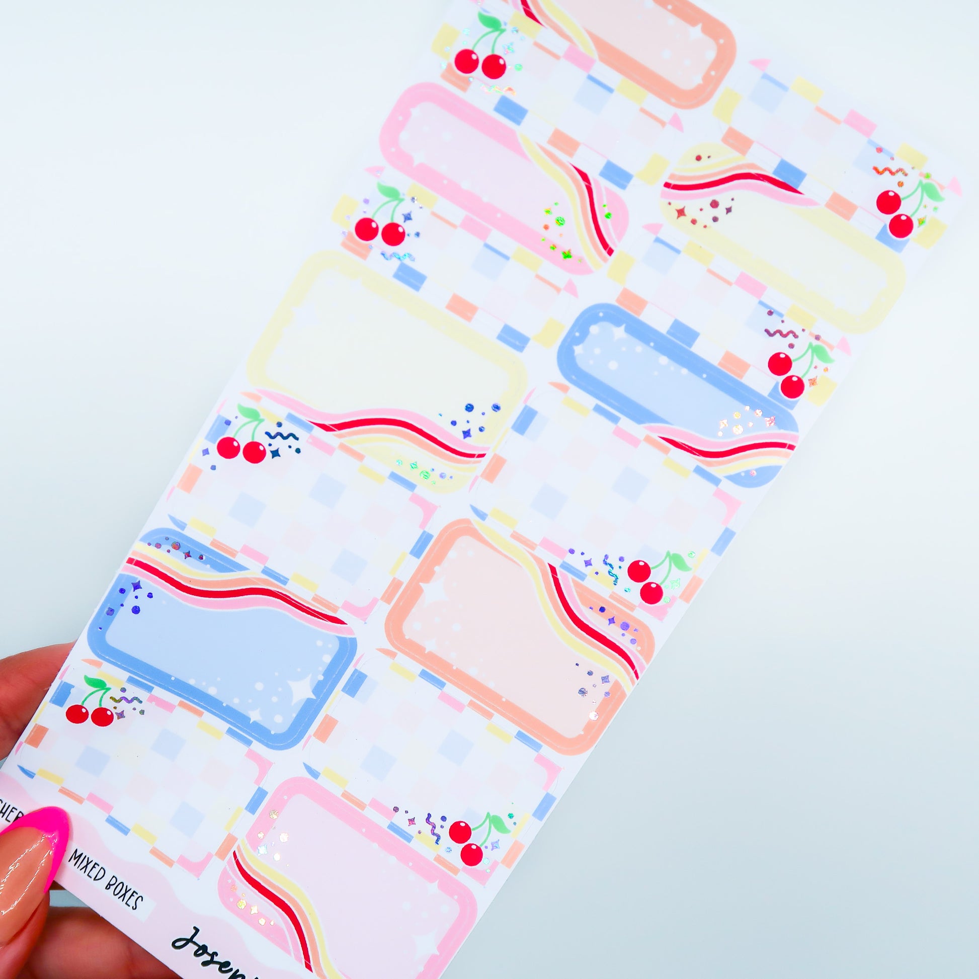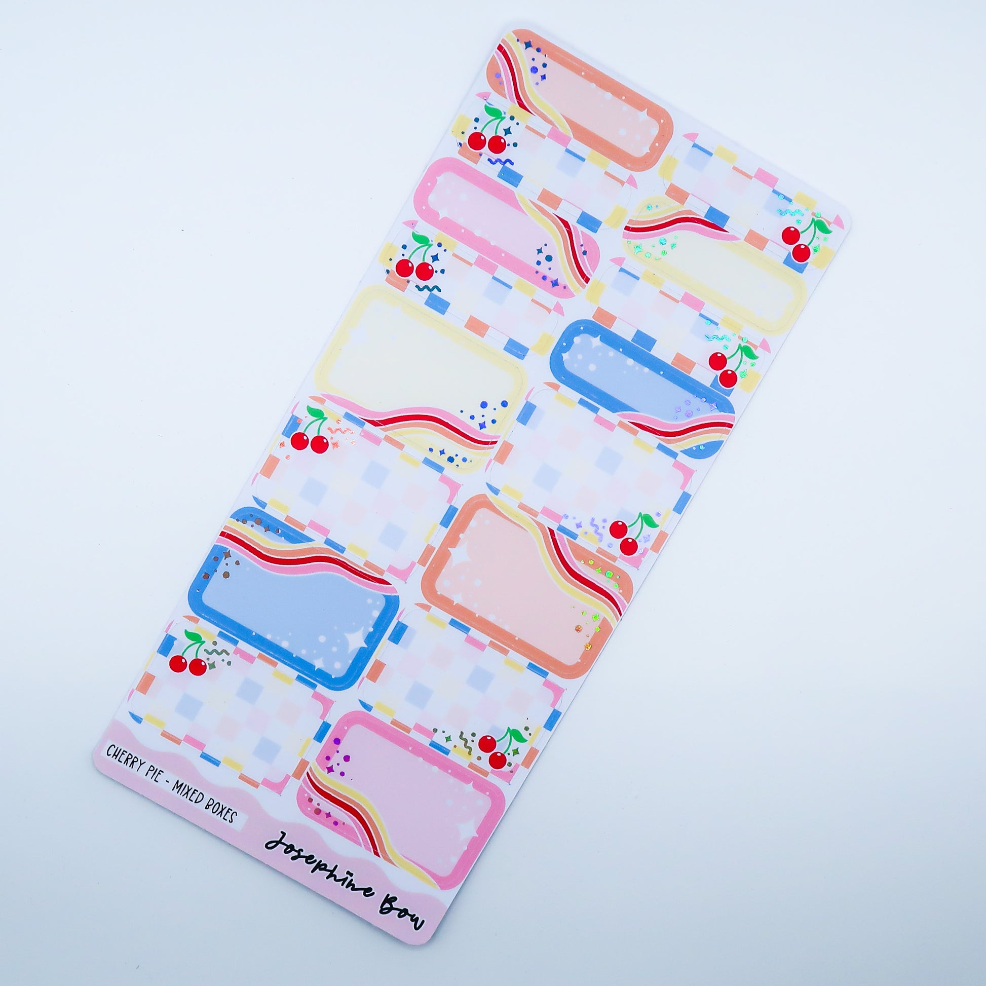 This is one sheet of mixed half and quarter boxes in a range of pretty colours with bow deco and foil decoration. These are great essentials to have in your collection for mixing with kits, co-ordinating with your favourite washi or just using to highlight a particularly important task or event.