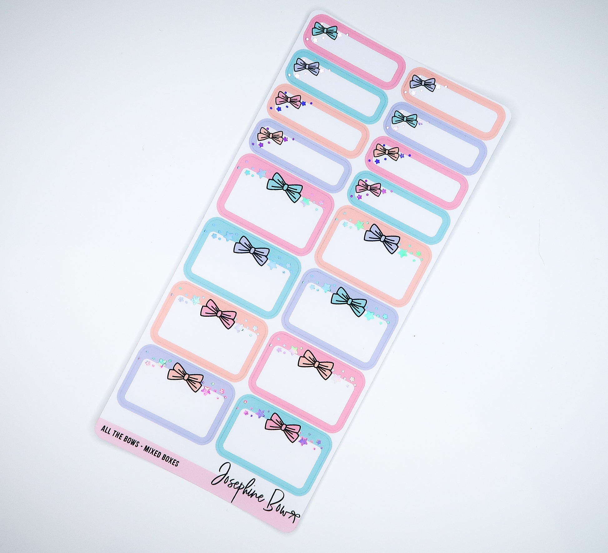 This is one sheet of mixed half and quarter boxes in a range of pretty colours with bow deco and foil decoration. These are great essentials to have in your collection for mixing with kits, co-ordinating with your favourite washi or just using to highlight a particularly important task or event.