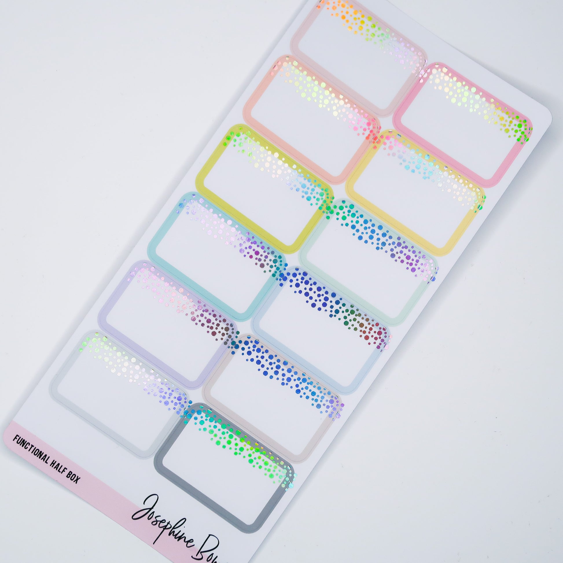 One sheet of half boxes in a range of pretty colours with spotty foil decoration. Great essentials to have in your collection for mixing with kits, co-ordinating with your fave washi or just using to highlight a particularly important task or event.