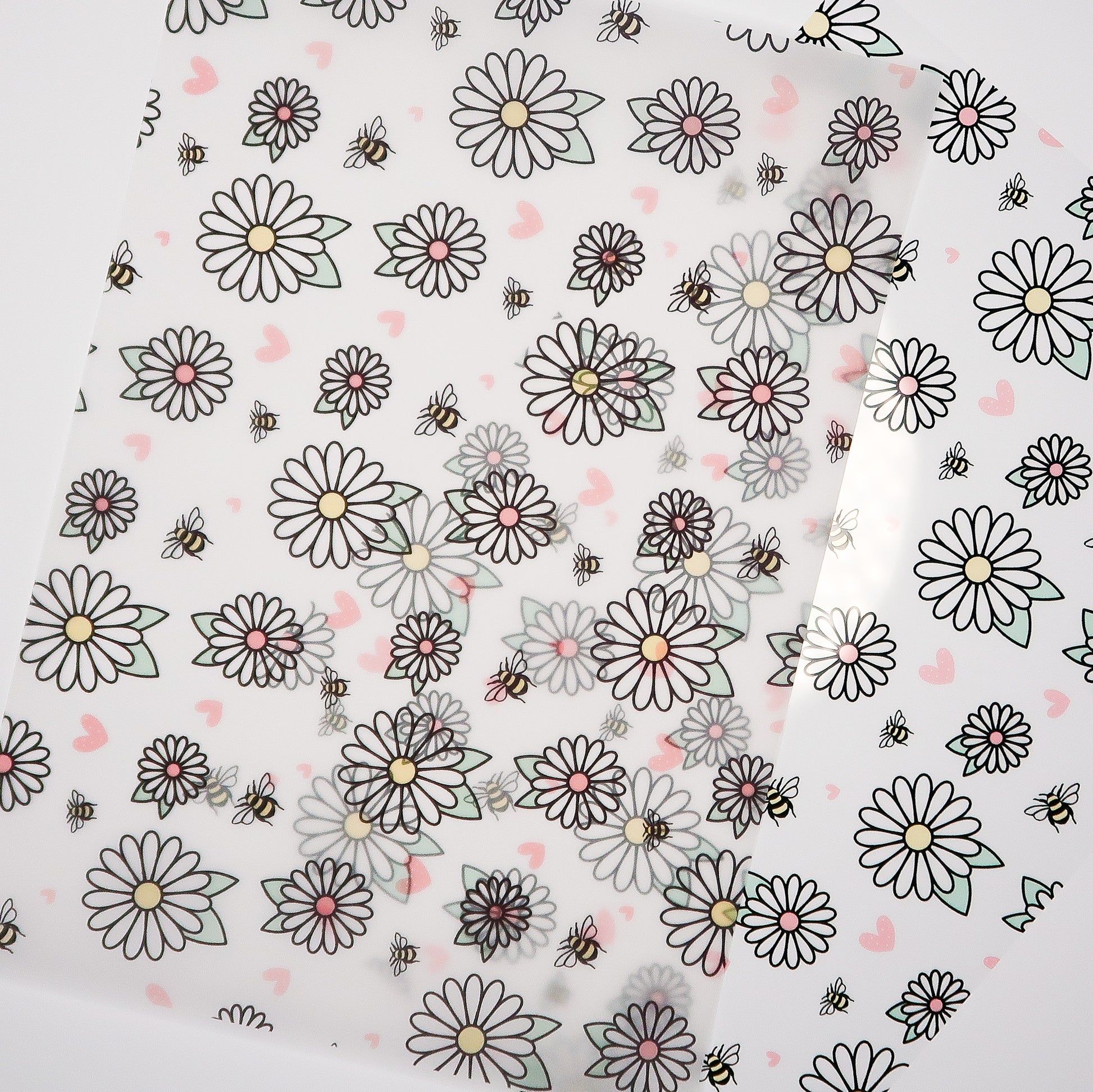 One sheet of A4 printed vellum with a pretty daisy and bee print design.