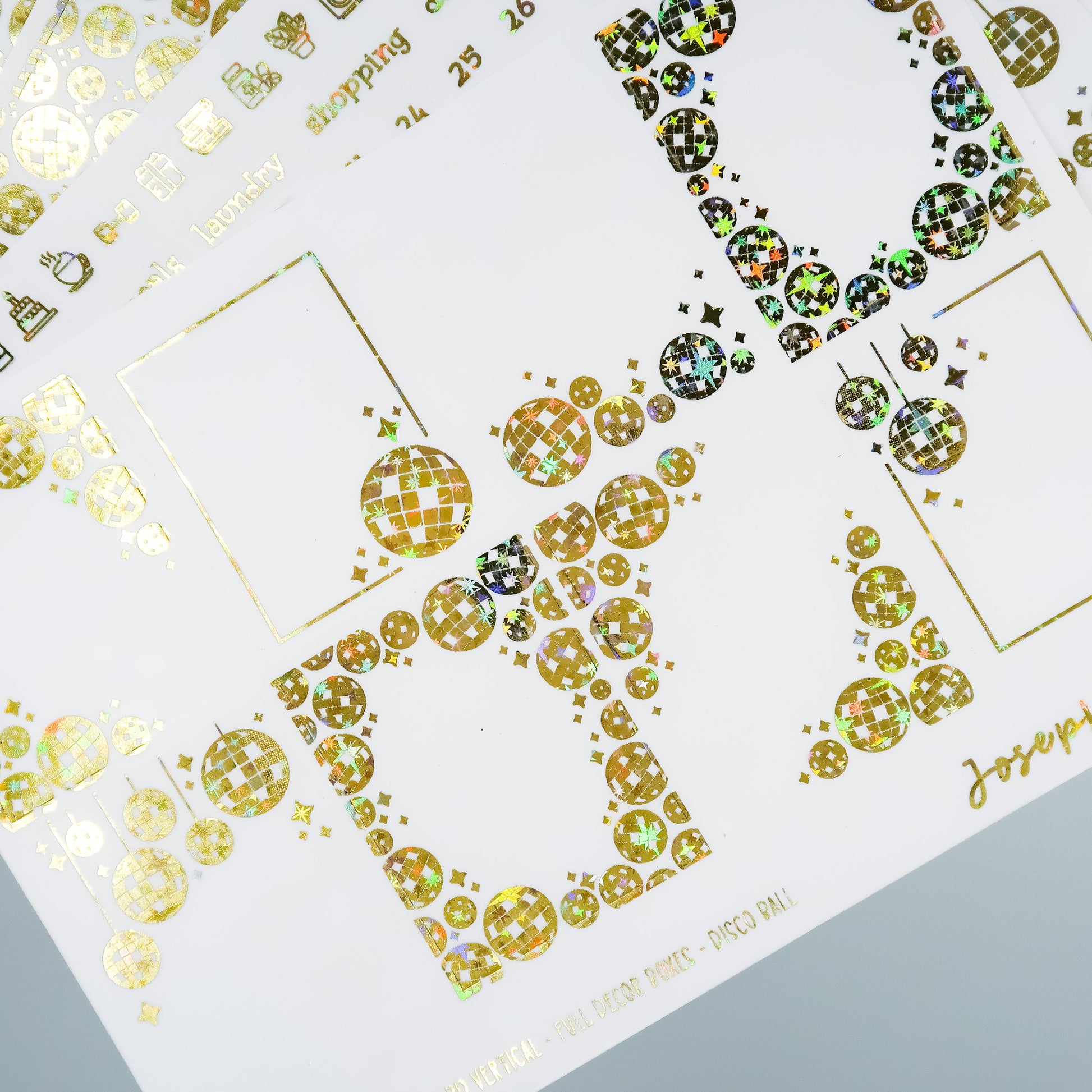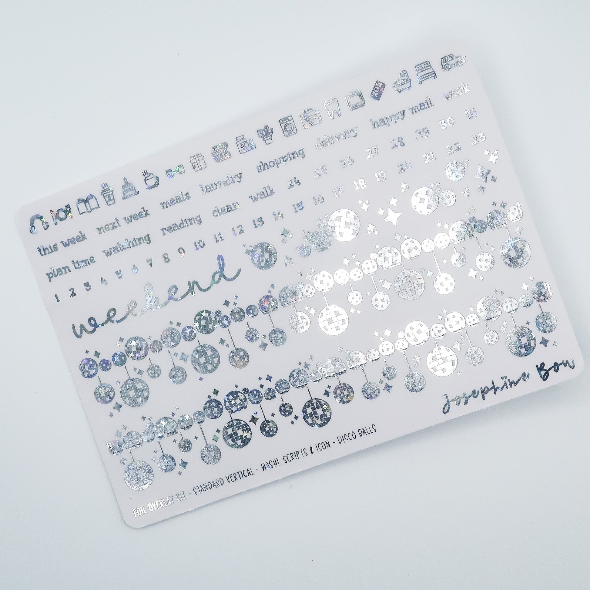 Disco Ball themed transparent foiled weekly overlay kit designed for vertical planners. For example many styles of 1.5in vertical planners and the standard Happy Planner.