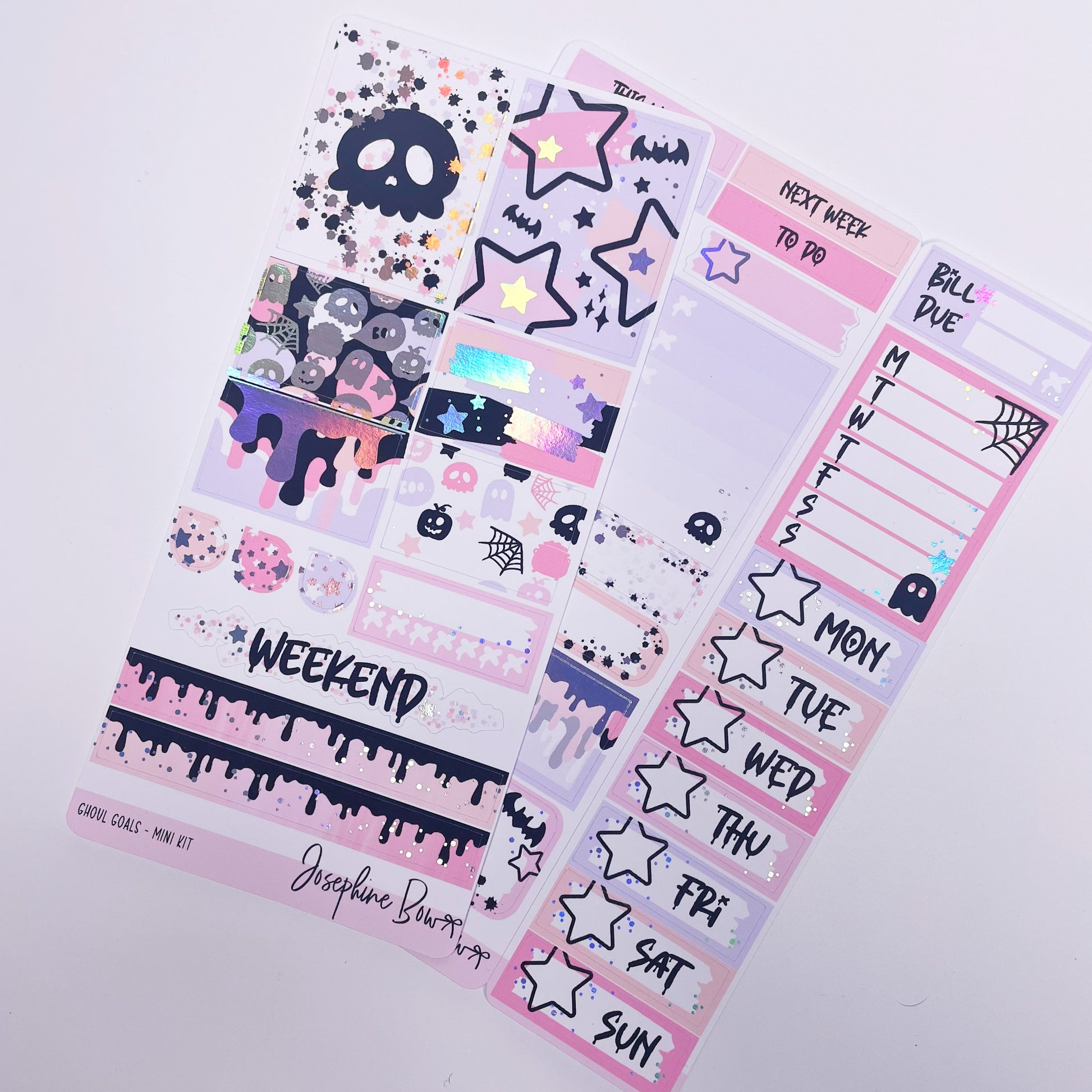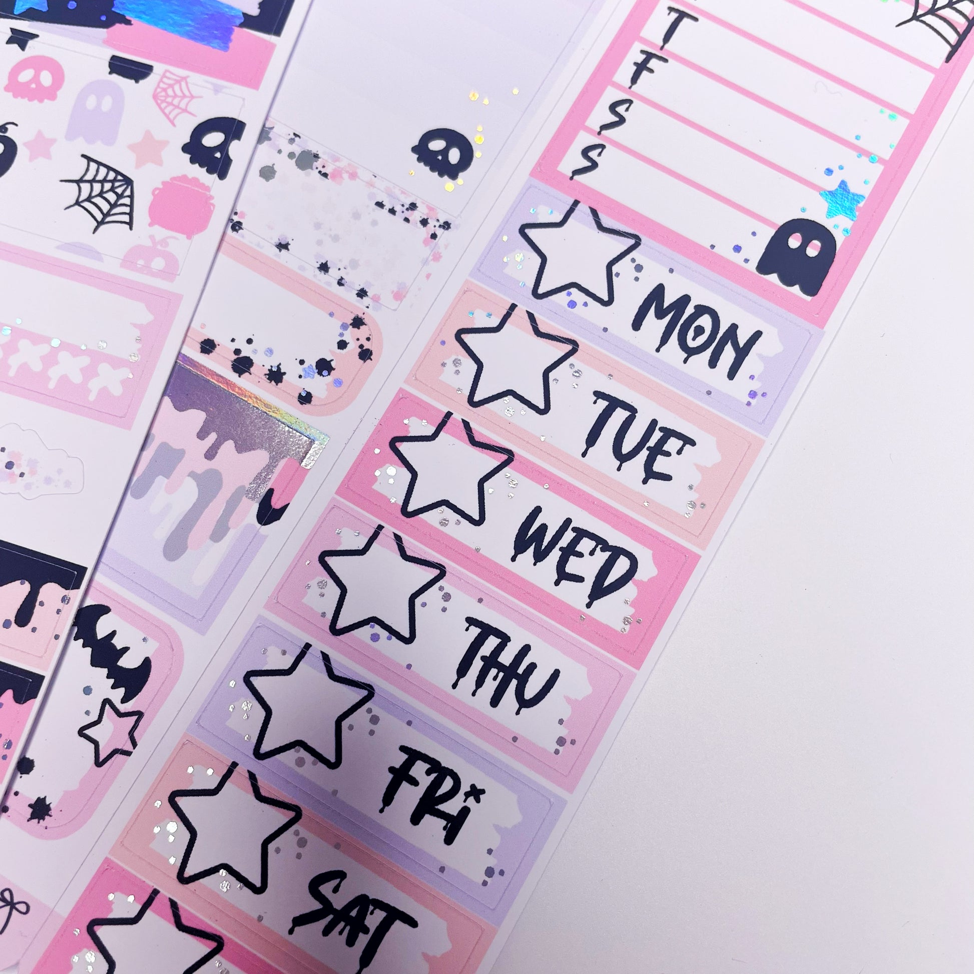 Holographic foiled weekly kit designed for the Print Pression Weeks, this kit will also work well in personal, B6 or pocket planners or as a mini kit, the boxes at 1.5in wide so compatible with many vertical planners.