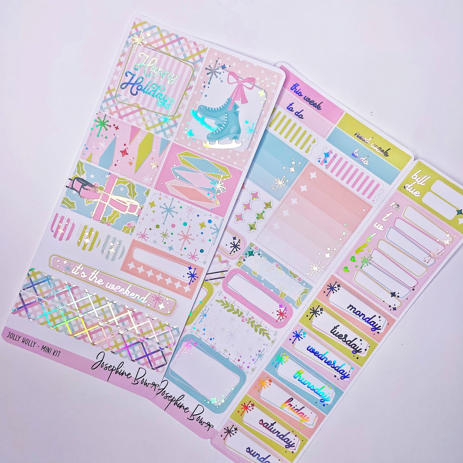 Holographic foiled weekly kit designed for the Print Pression Weeks, this kit will also work well in personal, B6 or pocket planners or as a mini kit, the boxes at 1.5in wide so compatible with many vertical planners.