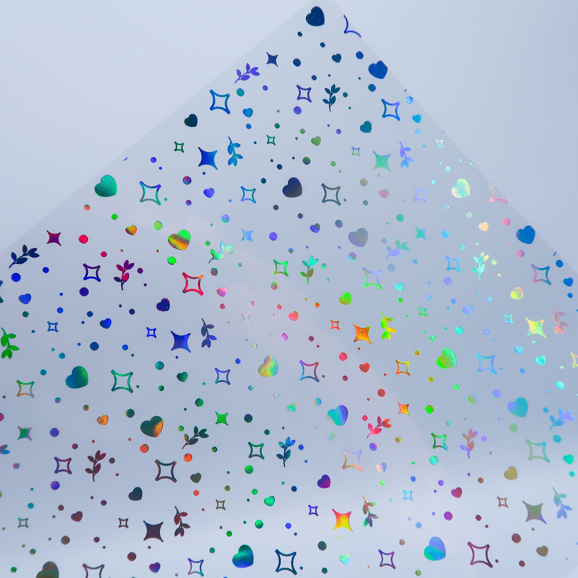 One sheet of A4 acetate with a scattered design of sparkles, hearts and leaves in holographic foil