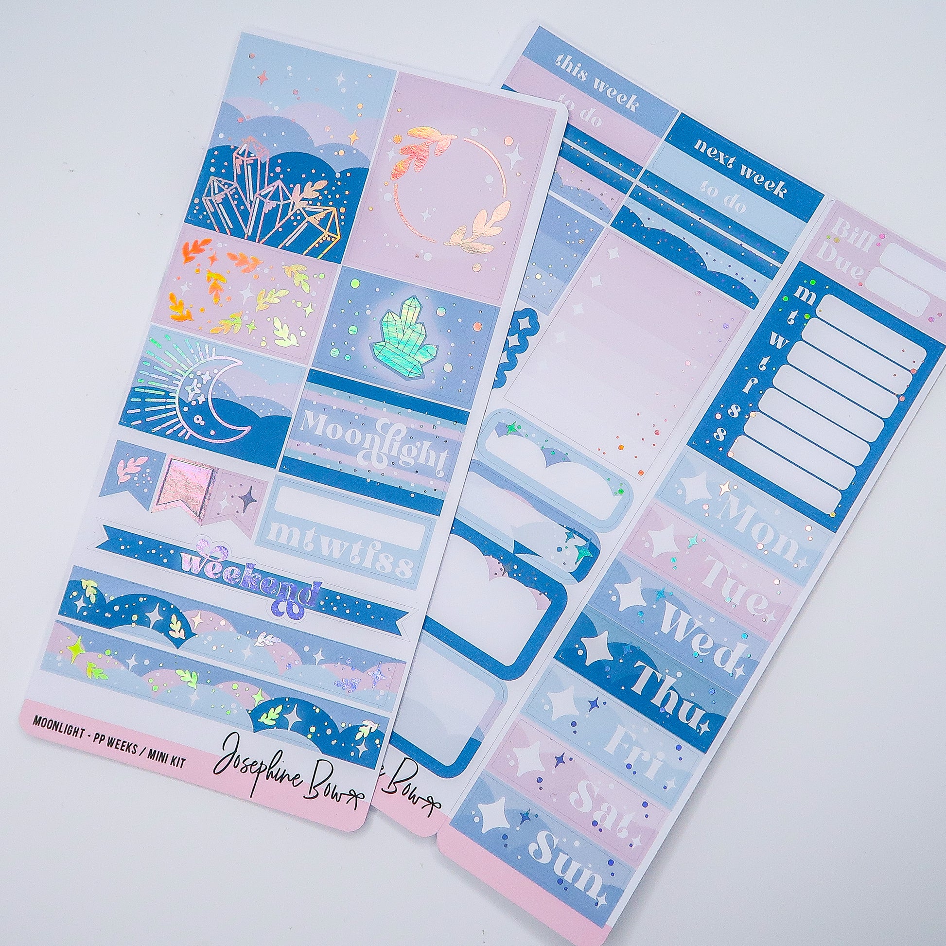 Holographic foiled weekly kit designed for the Print Pression Weeks, this kit will also work well in personal, B6 or pocket planners or as a mini kit, the boxes at 1.5in wide so compatible with many vertical planners.