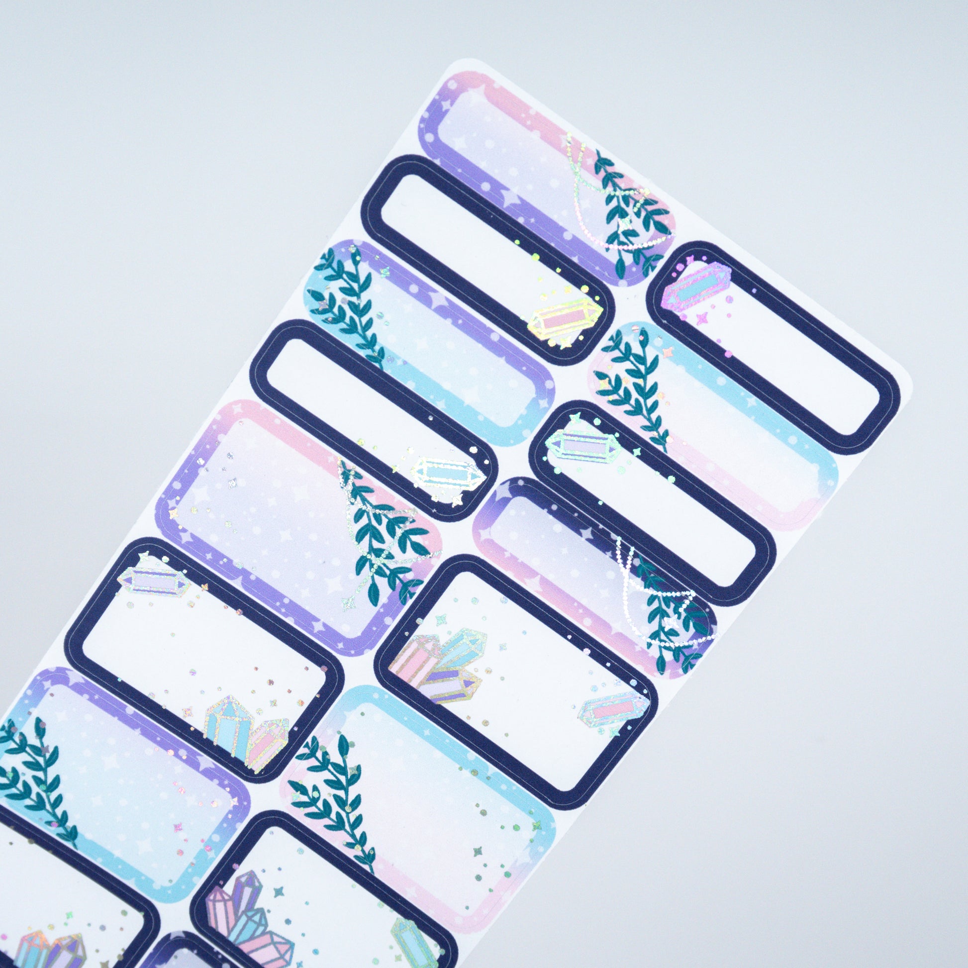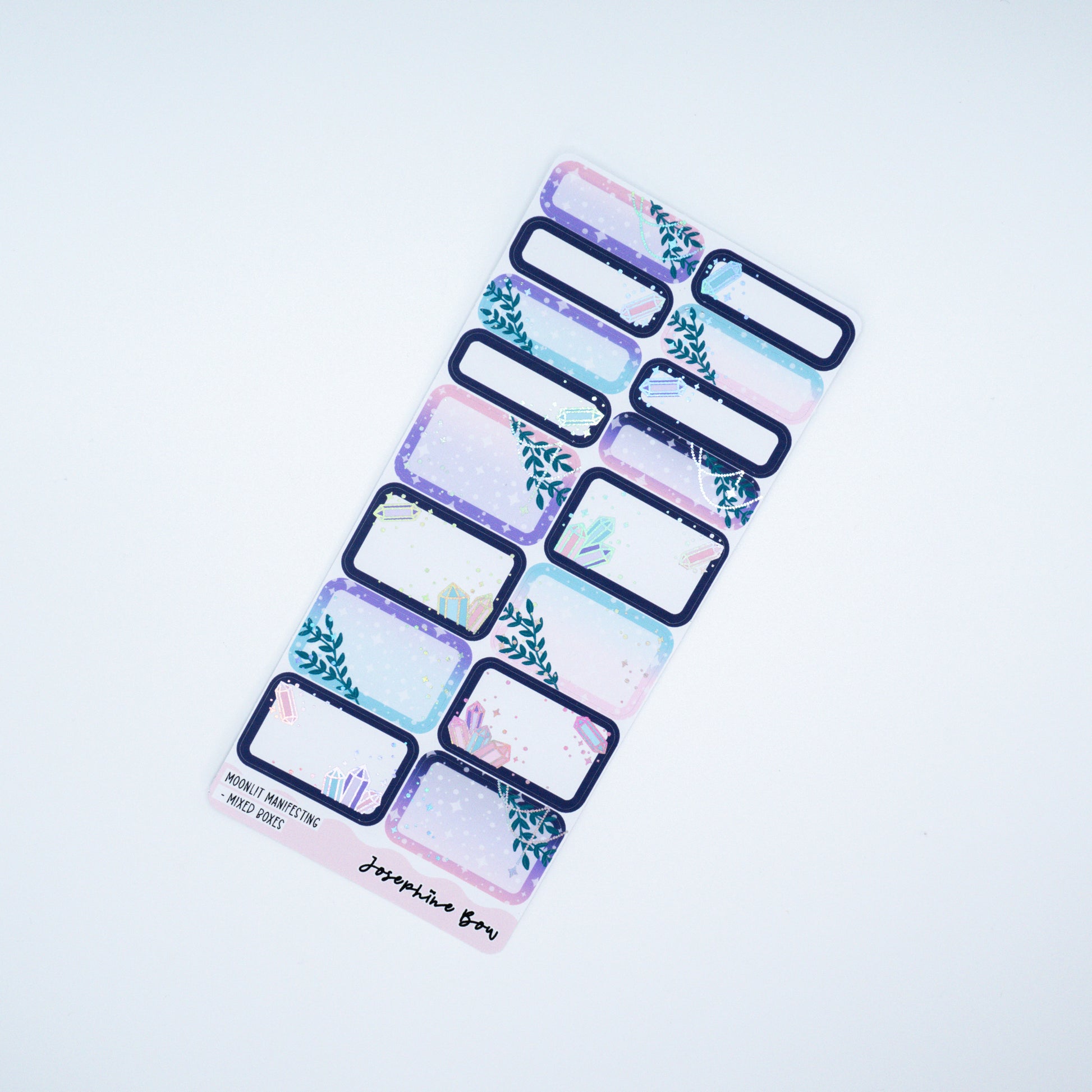 This is one sheet of mixed half and quarter boxes in a witchy, celestial theme. These are great essentials to have in your collection for mixing with kits, co-ordinating with your favourite washi or just using to highlight a particularly important task or event.