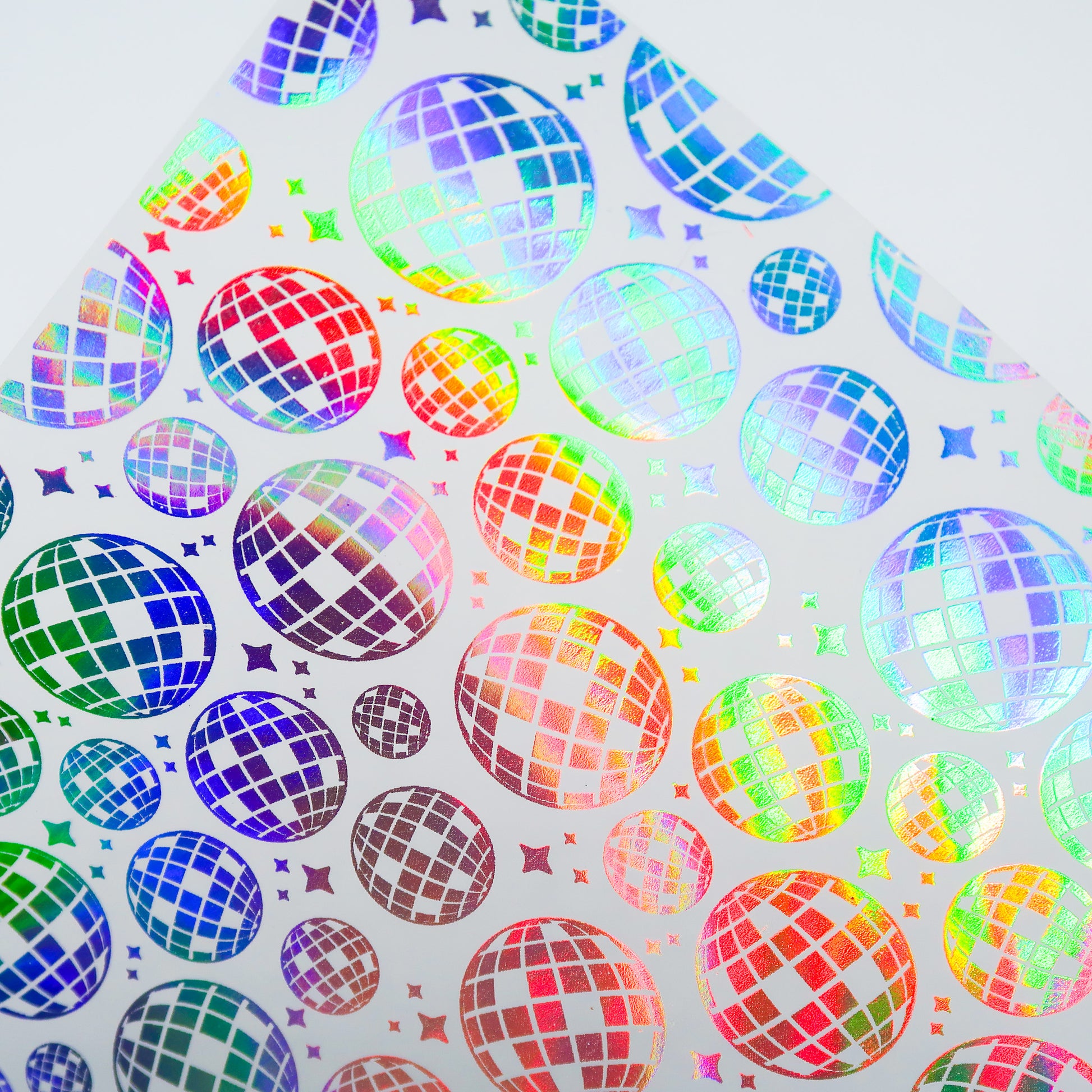 One sheet of A4 acetate with a scattered disco ball design in holographic foil. There is the option to choose between Sparkle Holo Foil to match the collection or standard Holo foil if you prefer slightly less disco!