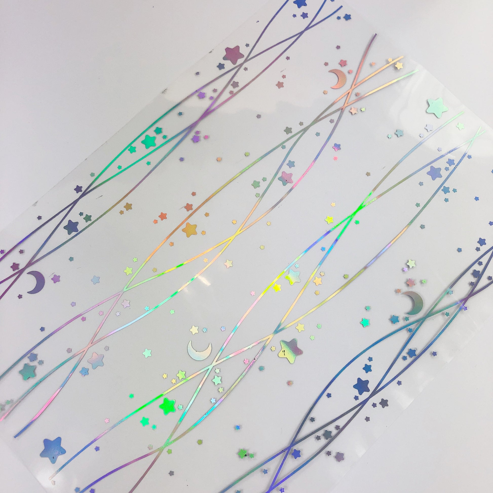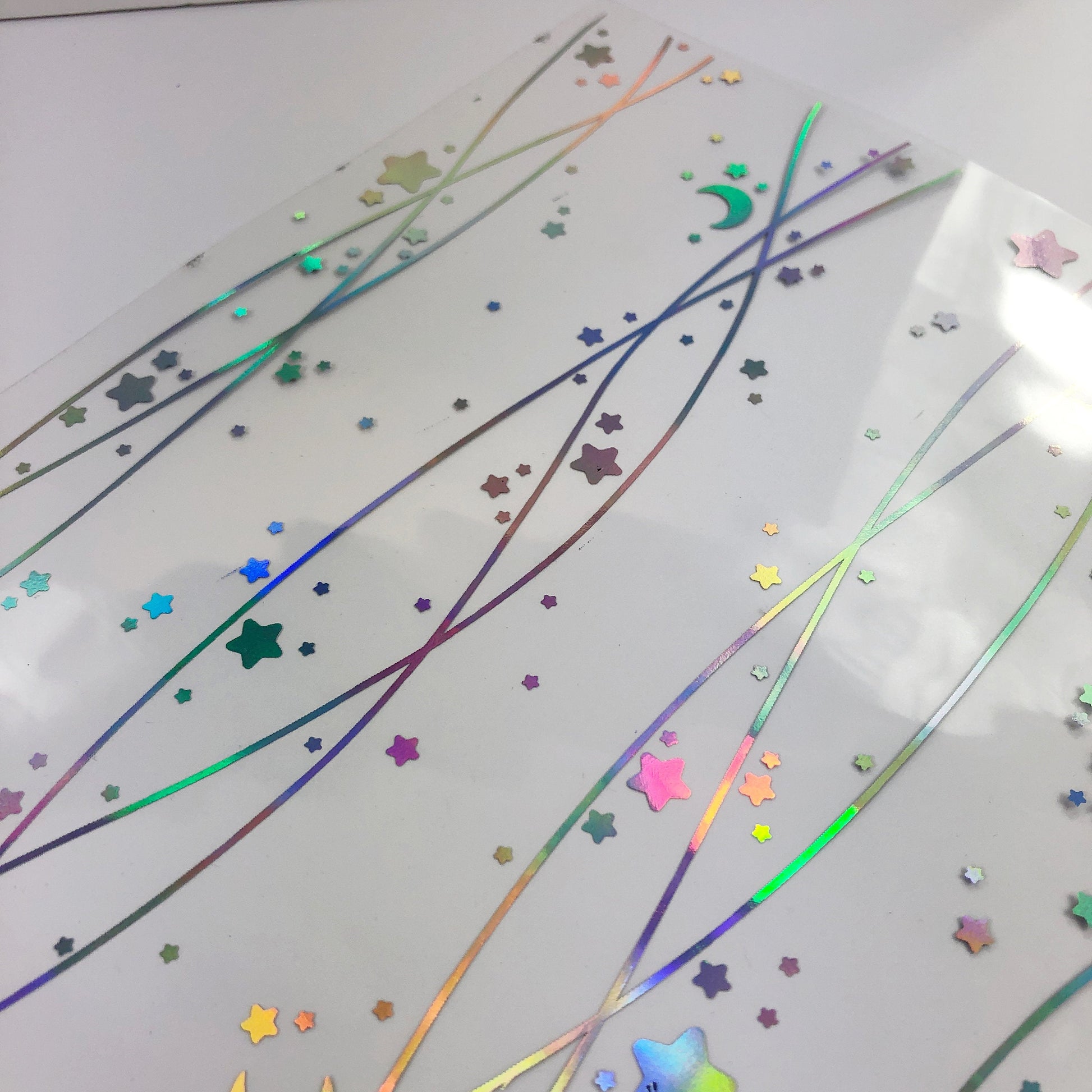 One sheet of A4 acetate with a scattered star and moon design in holographic foil.
